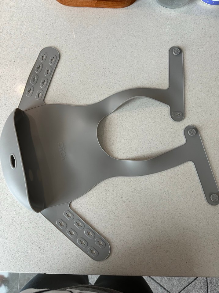 Oioi gri renginde, ayarlanabilir boyun askılı, silikon malzemeden yapılmış ve döküntüleri yakalamak için cep bulunan su geçirmez bebek önlüğü. Hiç kullanılmadı.
