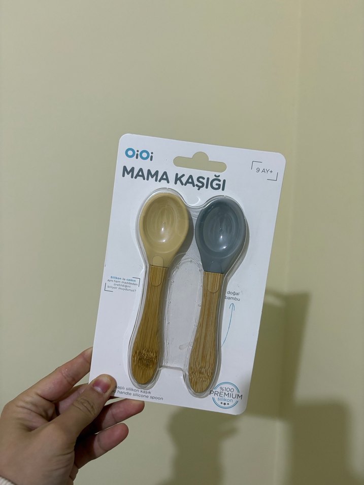 9 ay ve üzeri bebekler için khaki ve gri renkli, ahşap saplı mama kaşığı seti. Hiç kullanılmadı