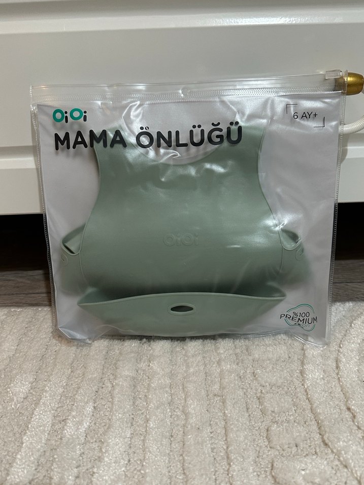 6 ay ve üzeri bebekler için yeşil baskılı mama önlüğü, döküntüleri yakalayan cepli yumuşak ve esnek malzeme ile üretilmiştir.
