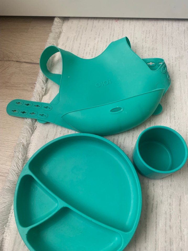Turkuaz renkli çocuk mama seti; bölmeli tabak, bardak ve ayarlanabilir kayışlı önlükten oluşur. Yumuşak ve dayanıklı malzemeden, kolay temizlenir. ️