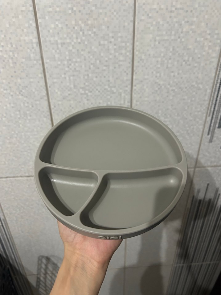 Gri renkte, üç bölmeli çocuk tabak seti. Dayanıklı ve çocuk dostu malzemeden yapılmıştır. Yeni gibi duruyor hiç bir sorunu yoktur
