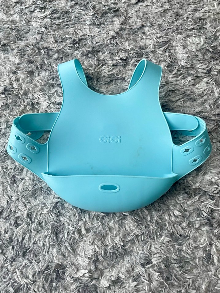 Ayarlanabilir yan düğmelere ve yiyecek yakalamak için cep kısmına sahip, yumuşak ve kolay temizlenen Oioi mavi bebek mama önlüğü.