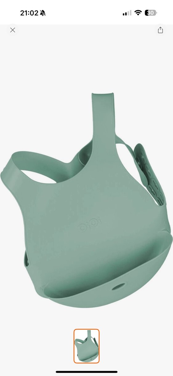 Yeşil renkte, yumuşak silikon malzemeden yapılmış, döküntüleri yakalayan cep içeren desensiz bebek önlüğü.