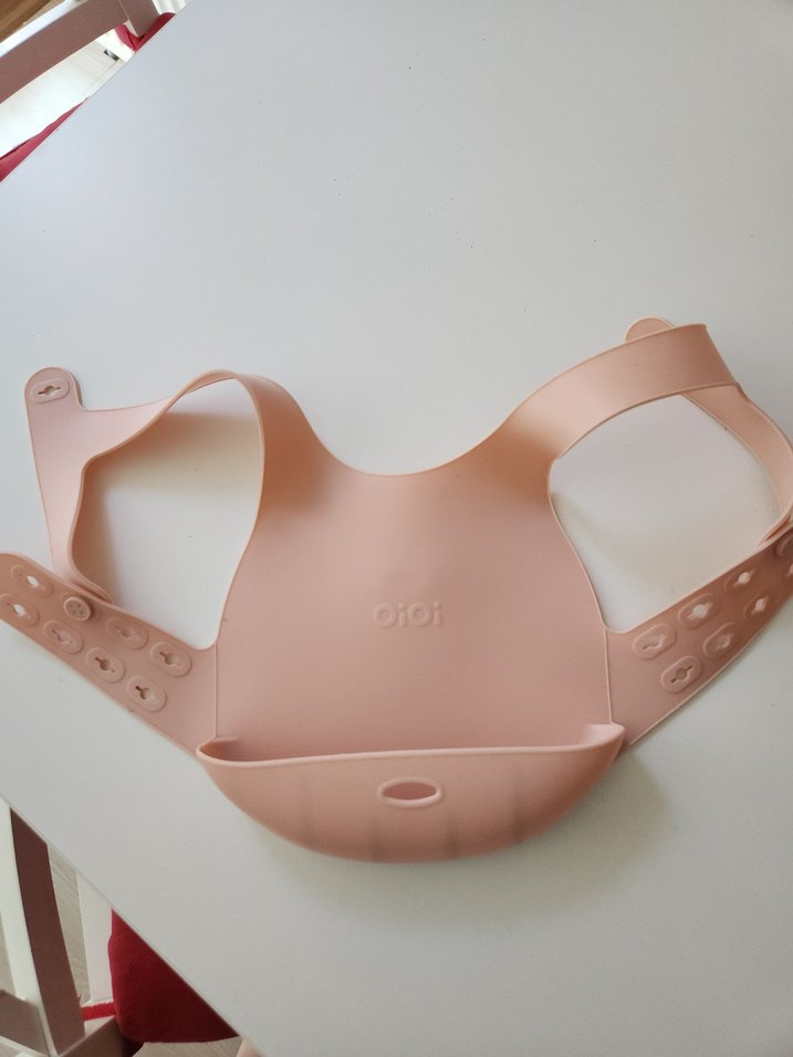 Pastel bej renkte, desen içermeyen, ayarlanabilir kayışlı ve döküntüleri yakalamak için cep bulunan yumuşak ve esnek kumaştan yapılmış bebek önlüğü.