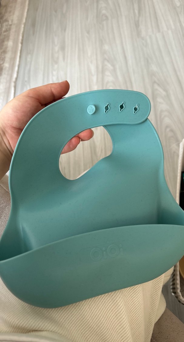 Pastel mavi renkte, ayarlanabilir boyun kısmı ve döküntüleri yakalayan derin cep bulunan yumuşak ve esnek bebek önlüğü.