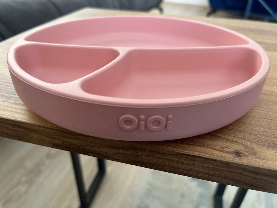 OiOi markalı, pastel pembe renkte, üç bölmeli çocuk tabak seti. Dayanıklı ve çocuk dostu malzemeden üretilmiştir. ️