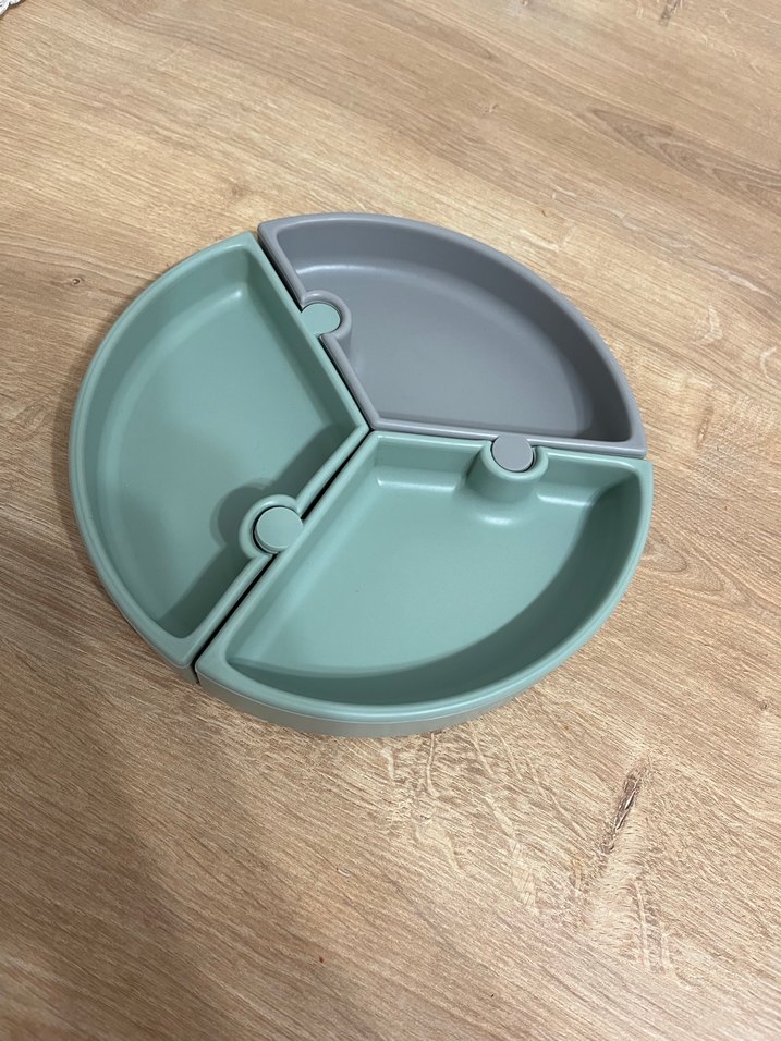 Gri tonlarında, çocuklar için üç bölmeli dayanıklı tabak seti. Öğünleri düzenli tutar. ️
