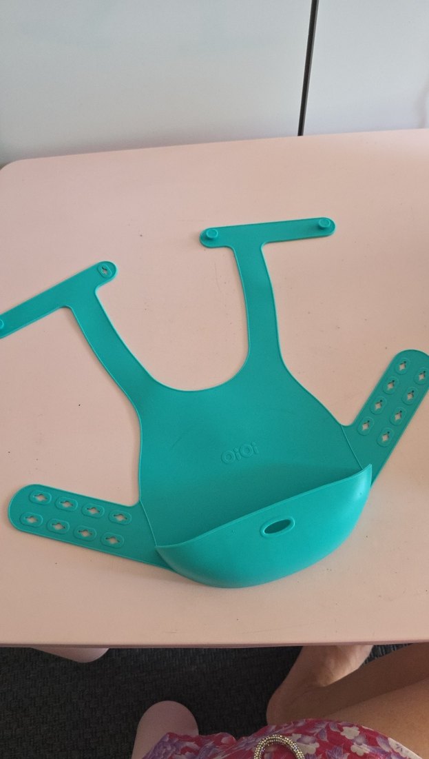 Oioi markasının turkuaz renkli bebek önlüğü, yumuşak ve esnek malzemeden, ayarlanabilir toka ve döküntüleri yakalayan cep özelliklerine sahiptir.