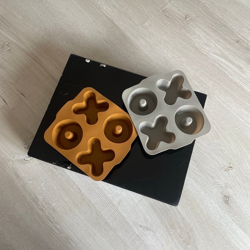 Kahverengi ve gri renklerde, X ve O şeklinde iki adet kek kalıbı seti, eğlenceli kekler için uygundur.