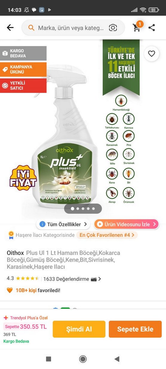 Oithox Plus UL 1 litrelik sprey böcek ilacı, hamam böceği, karasinek, kene, bit, sivrisinek gibi birçok haşereye karşı etkilidir. Kolay kullanımlı sprey şişede sunulur.