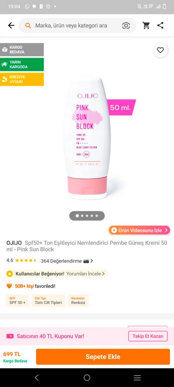 OJIJO Pink Sun Block, SPF50+ koruma sağlar, cilt tonunu eşitler ve nemlendirir. Tüm cilt tiplerine uygundur, mavi ışık filtresi içerir. Renk etkisi yoktur, 50 ml tüpte sunulur.