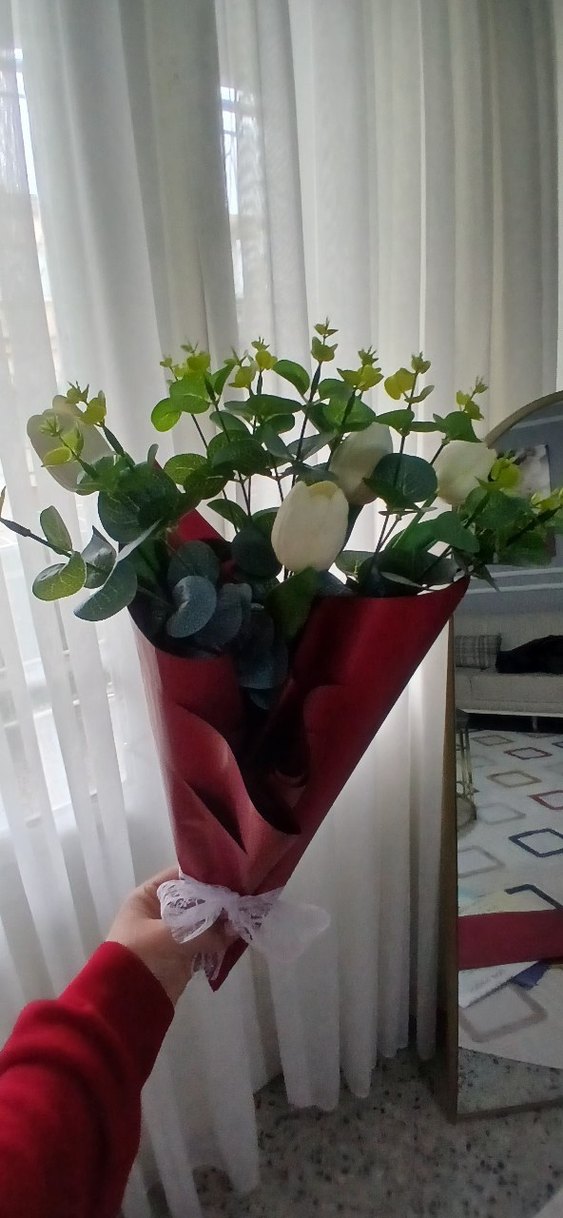 Beyaz lalelerden oluşan buket, kırmızı kağıtla sarılmış ve beyaz dantel kurdele ile bağlanmıştır. Yeşil yapraklar ve küçük sarı tomurcuklar içerir.