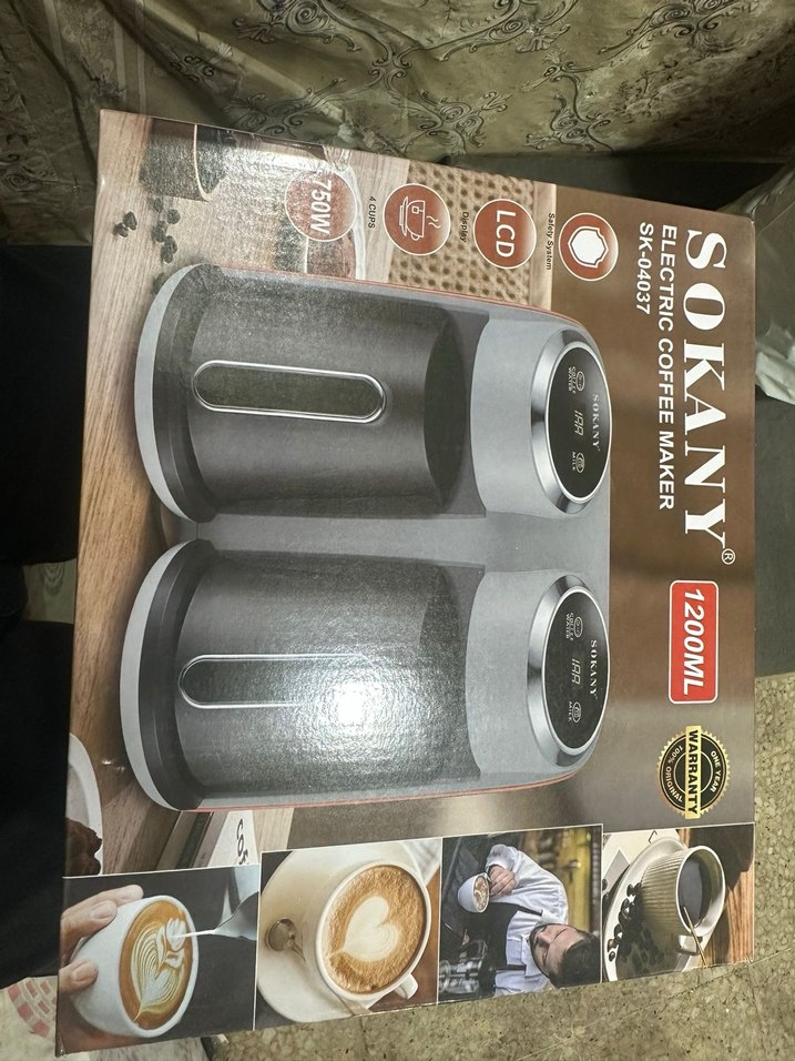 Okany elektrikli kahve makinesi 1200ml kapasiteye, LCD ekrana ve 750W güce sahiptir. Gri rengiyle modern bir görünüm sunar. ☕