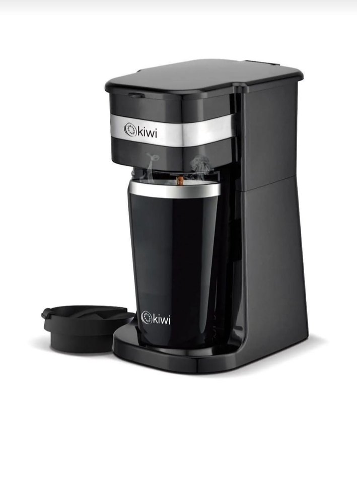 Okiwi siyah kahve makinesi, kapaklı uyumlu bardak ile birlikte gelir. Kompakt tasarımıyla kolay kullanım sağlar. ☕️