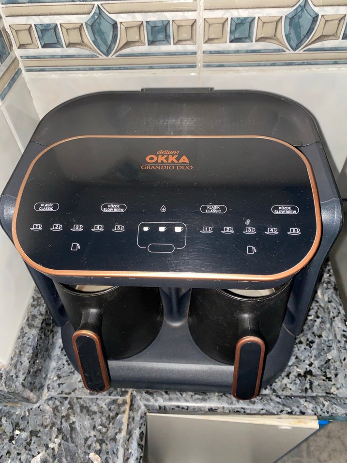 Okka Grandio Duo, siyah bakır rengindedir. kutusu bulunmamaktadır. Ürünün temizliği yapılırken cezvelerin dibinin parlaklığını kaybettirdim ancak çalışmasında sorun yoktur. Dokunmatik ekran jelatini bile sökülmemiştir. Aynı anda 10 fincan Türk kahvesi yapma özelliği, fincan boyutu ayarlama seçeneği, közde kahve ve normal kahve yapma özelliği, 2.3 litre büyük su tankı vardır. Ekranı dokunmatik ekrandır. Pazarlık payı mevcuttur.