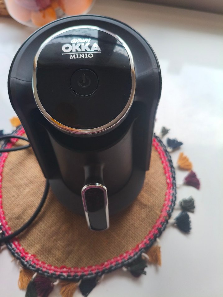 Okka Minio siyah kahve makinesi, üstte güç düğmesi ve kahve akıtma ucu ile kompakt tasarıma sahiptir. ☕ sayılı kullanılmıştır yeniden farksız göründüğü gibi detaylı resim.