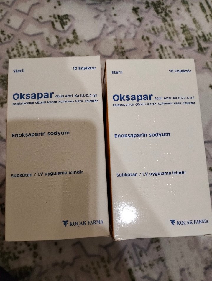 Oksapar, enoksaparin sodyum içeren steril 10'lu enjektör paketi. 0,4 ml hacminde, subkutan veya intravenöz uygulama içindir. KOCAKFARMA üretimi. iki kutu fiyatıdır son kullanma tarihleri paketlerin üstünde yazıyor.