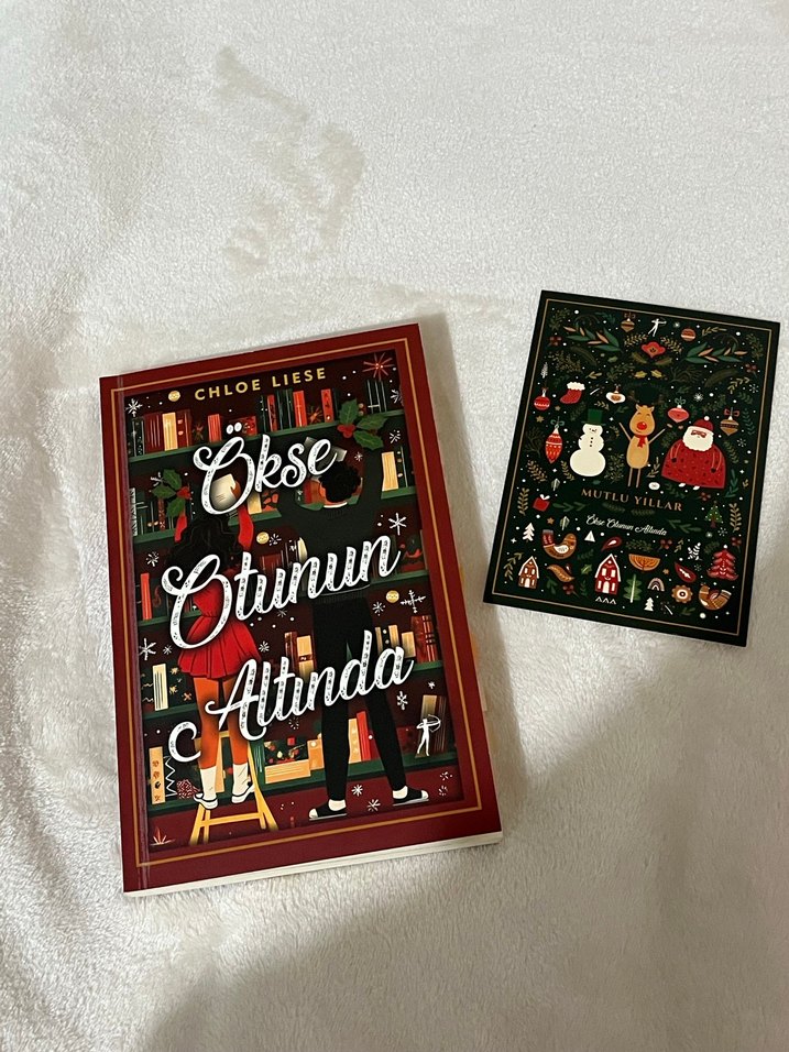 Chloe Liese'nin bu romanı, kitap rafları ve Noel süslemeleriyle sıcak bir tatil atmosferi sunuyor. Yanında Noel temalı kart bulunuyor.