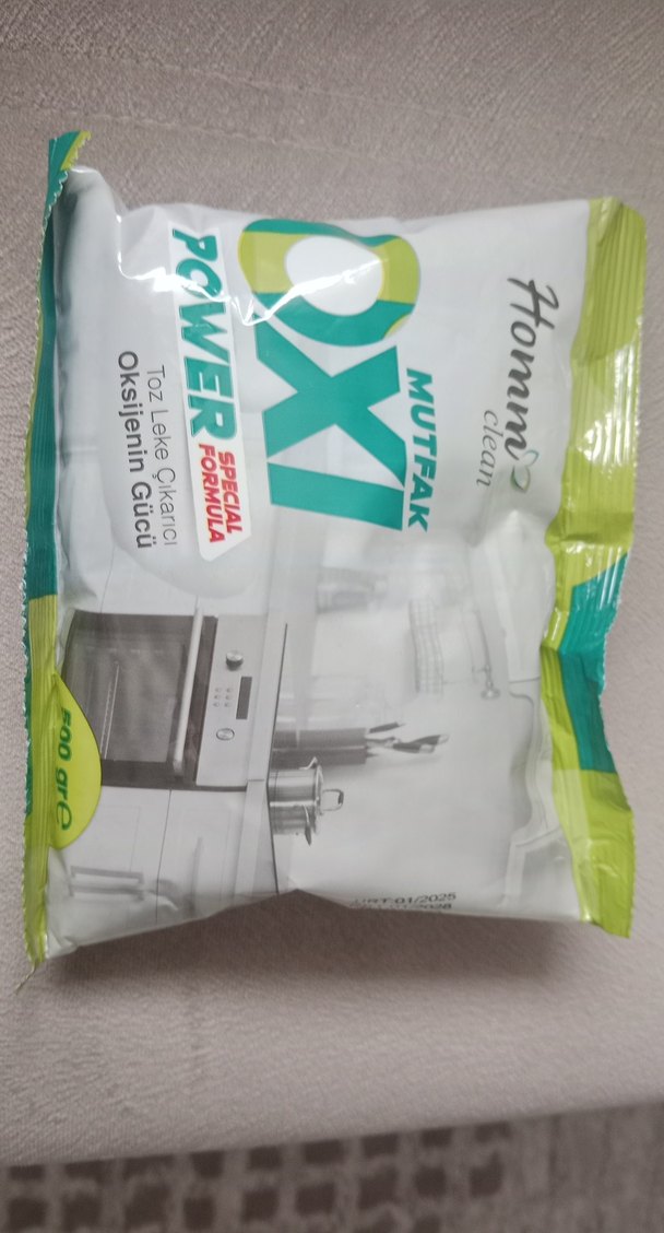 Oksijen gücüyle leke çıkaran beyaz mutfak toz temizleyici, 500 gram paketle sunulur. kullanım alanları fotoya eklendi