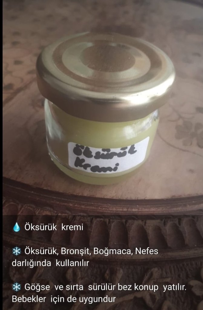 Öksürük, bronşit, boğmaca ve nefes darlığında kullanılan krem. Göğüs ve sırta sürülür, bezle kaplanıp yatılır. %100 doğal el yapımı
