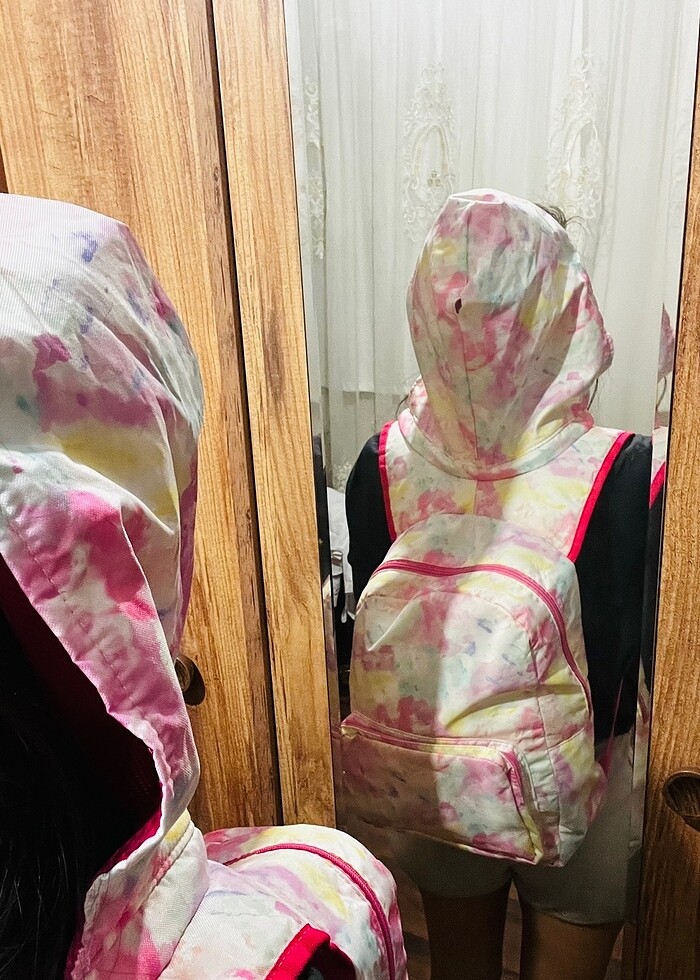Hiç bir sıkıntısı yoktur Yenidir kullanılmadı Kapüşonlu çantadır yağmurdan korunmak için Yağmur geçirmez Kapüşon fermuarlıdır çıkarılabilir