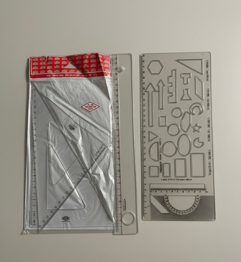 Hassas ölçüm ve çizim için cetvel ve şekil iceren paket birisi kilifindadir