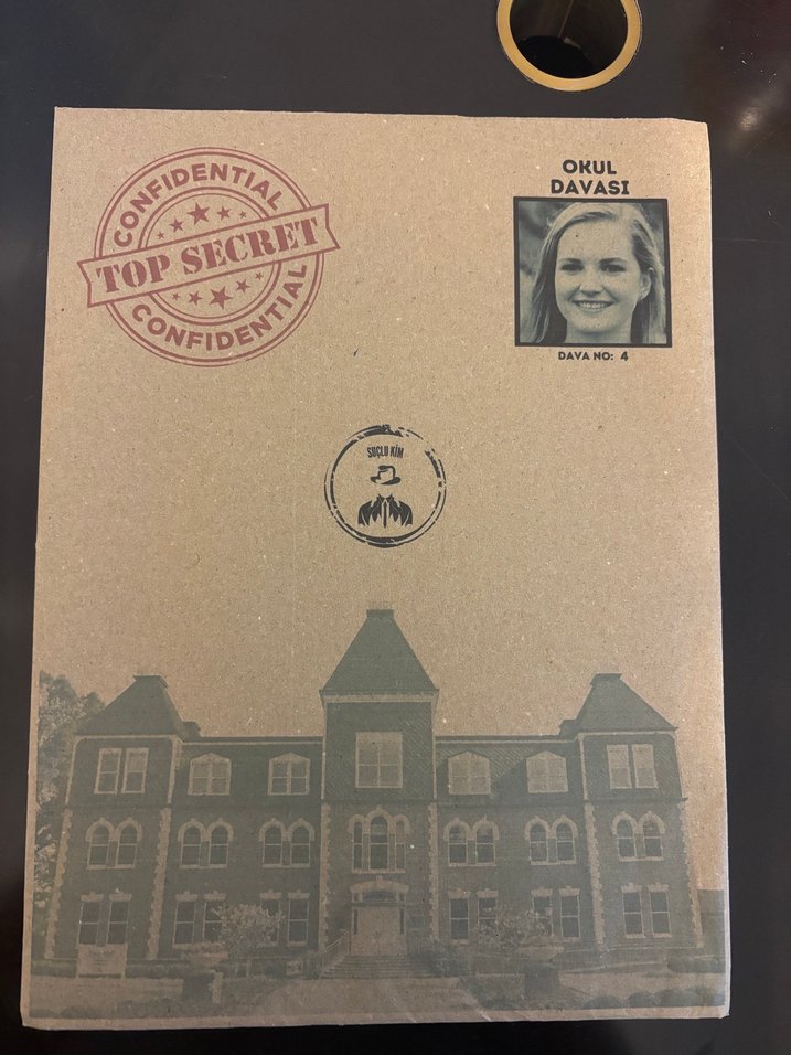 Okul Davası adlı tarih kitabı, gizli belge temasıyla eski bir okul binası ve 'Top Secret' damgası içerir. Siyah-beyaz fotoğraf 'Dava No: 4' olarak işaretlenmiştir.