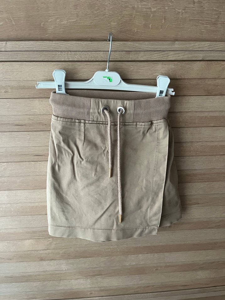 Bej süet kumaştan, kemerli ve bağcıklı ribanalı bel kısmına sahip, rahat kesim mini etek. Günlük dış mekan kullanıma uygundur.