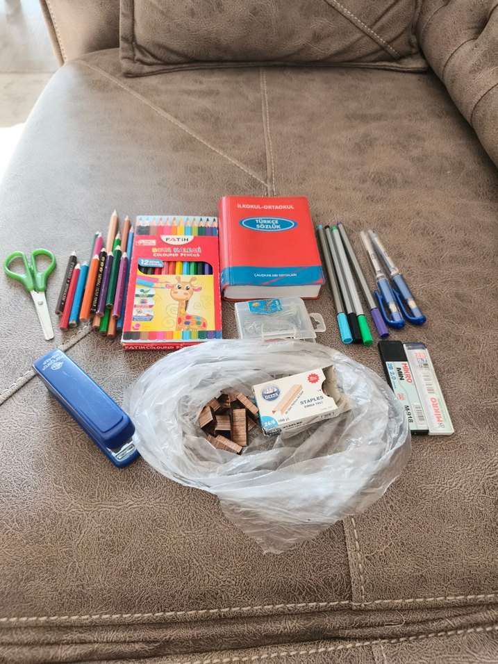 Bu okul etkinlik malzemeleri setinde renkli kalemler, makas, kalemler, zımba, zımba teli, kalemtıraş ve tahta bloklar bulunmaktadır. ️Kullanılmış boyalar öylesine gönderilecek.