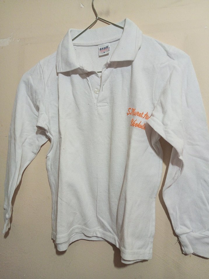 Pamuk kumaştan, düğmeli ve yakalı beyaz uzun kollu okul t-shirtü , bol kesim ve sade tasarıma sahiptir. 7-8 yaşa uygun.