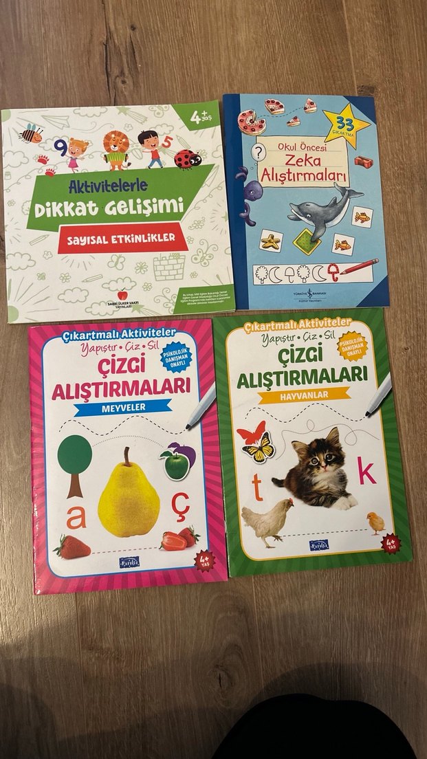 Okul öncesi dikkat gelişimi, sayısal etkinlikler ve meyve ile hayvan temalı çizgi alıştırmalarını içeren aktivite kitapları seti. Üsttekiler yenidir, sadece alttaki “çizgi çalışmaları”ndan bir kaç sayfa kullanılmıştır.