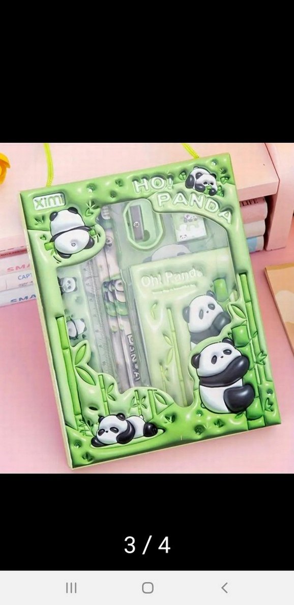Pastel yeşil renkli çocuk kırtasiye seti, panda figürleriyle süslenmiştir ve çeşitli yazı araçları içerir.