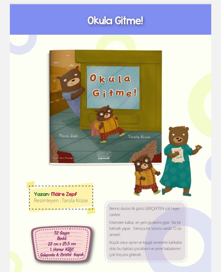 Maire Zepf'in yazdığı, Tarsila Kruse'nin resimlediği "Okula Gitme!" çocuk kitabı 32 sayfa, 22x25,5 cm boyutlarında, spiral ciltli ve sert kapaklıdır.