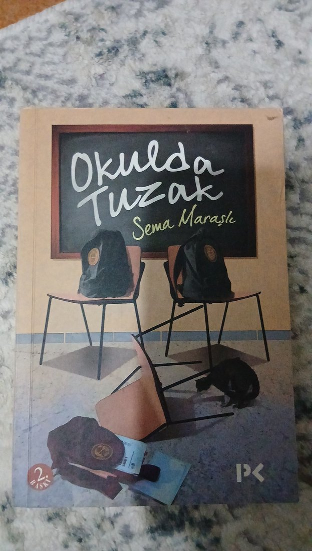 Sema Maraşlı'nın "Okulda Tuzak" kitabı, okul ortamında çantalar ve devrilmiş bir sandalye ile gizemli bir hikaye sunuyor.