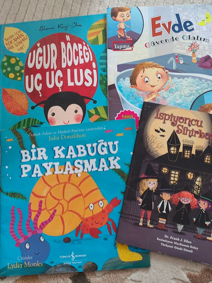Okulöncesi ve 1. sınıfa uygun isbankasi ve Sabri Ülker yayınlarından çok güzel, kaliteli ve eğlenceli cizimlerle 4 adet kitap. herhangi bir yırtık vs yoktur.