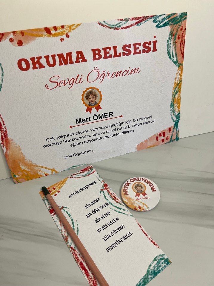 Öğrencinin okuma başarısını kutlayan kişiselleştirilmiş sertifika, kalem ve rozetten oluşan okuma belgesi seti.