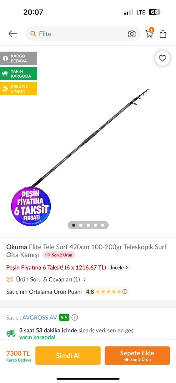 Okuma Flite Tele Surf 420cm teleskopik olta kamışı, 100-200gr ağırlığındaki yemler için uygundur. Taşıması kolaydır ve güvenilir performans sunar. Bir iki kez kullanıldı. Hiç bir sorunu yok. Bize büyük geldiği için daha küçük bi set alacağım.