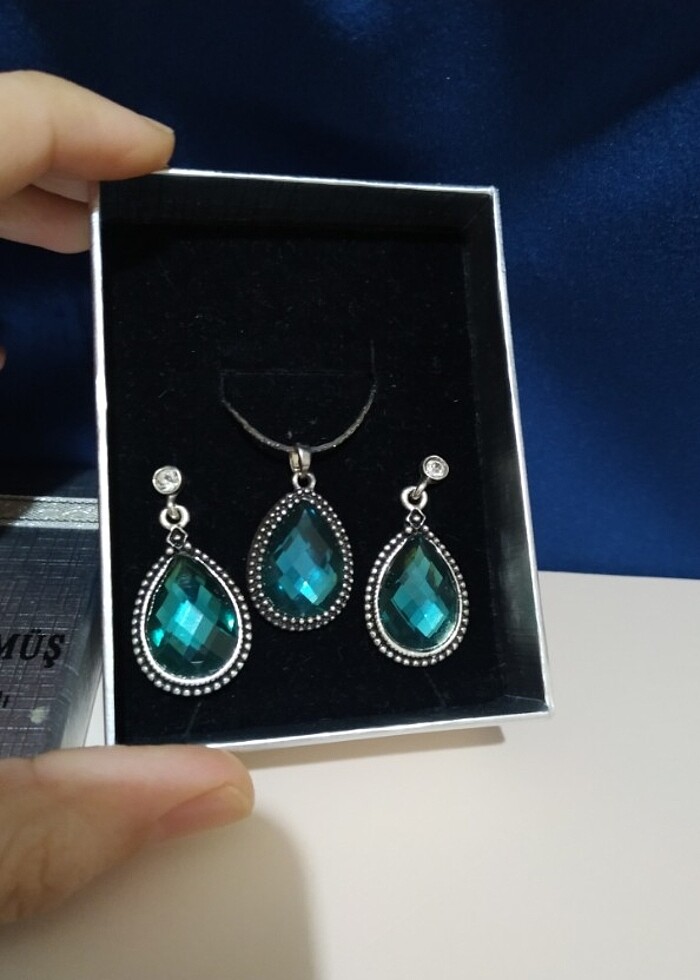 Damla model okyanus mavi 18KGP kolye küpe takı seti hiç kullanılmamıştır. 18 ayar altın kaplama kolyedir. Fotoğraflarda detaylı olarak görebilirsiniz