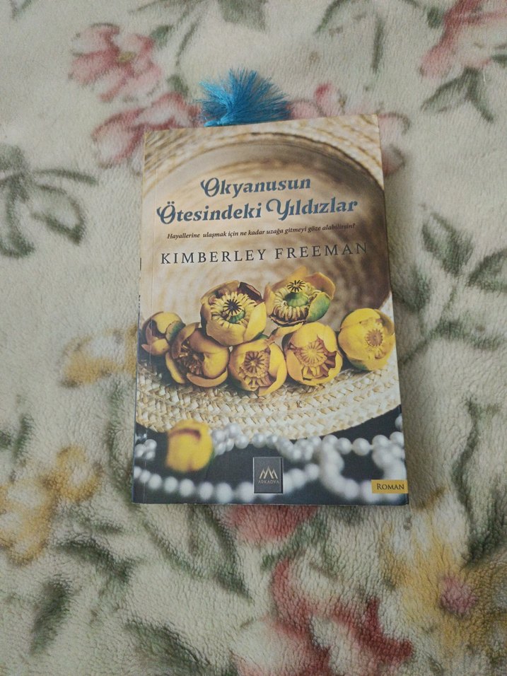 Kimberley Freeman'ın romanı "Okyanusun Ötesindeki Yıldızlar" umut ve hayatta kalma temasını işler. Sarı çiçekler ve inci kolye kapağı dikkat çekiyor.