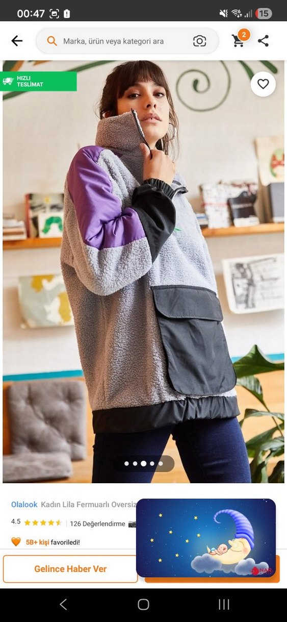 Olalook kadın ceketi, yüksek yakalı, uzun kollu ve oversize kesimdir. Yumuşak fleece kumaş, ön fermuar ve büyük cep detaylarıyla gri ve lila renklerde sunulur.
