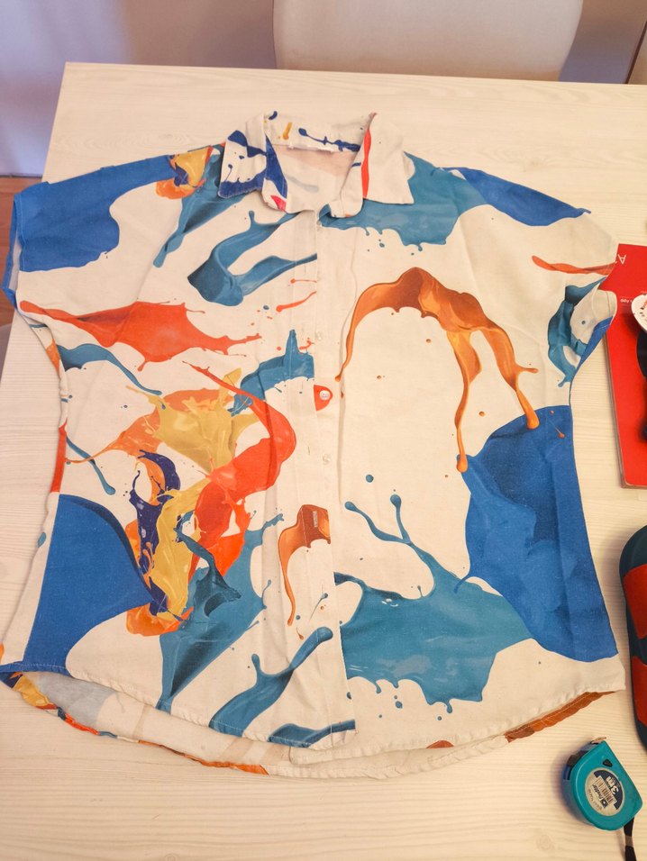 Olalook L beden Renkli baskılı, kısa kollu, yakalı ve bol kesim kadın gömleği sulu boya desenli.