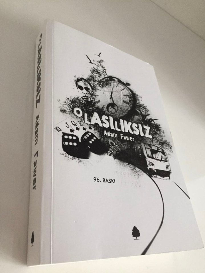 Adam Fawer'ın 96. baskı olan "Olasılıksız" adlı romanı, zar, saat ve tren çizimleriyle şans ve zaman temalarını yansıtıyor ⏳.
