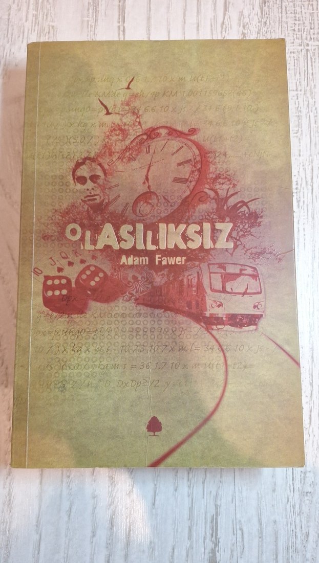 Adam Fawer'ın "Olasılıksız" romanı, şans ve zaman temalarını yansıtan saat, zar ve tren görselleriyle kapak tasarımına sahip.