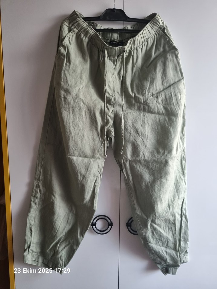 yeşil renkli, beli kemerli keten kadın pantolon. Rahat kesimli, normal midi boyda, desensiz ve günlük kullanıma uygun. Tane fiyatı 150