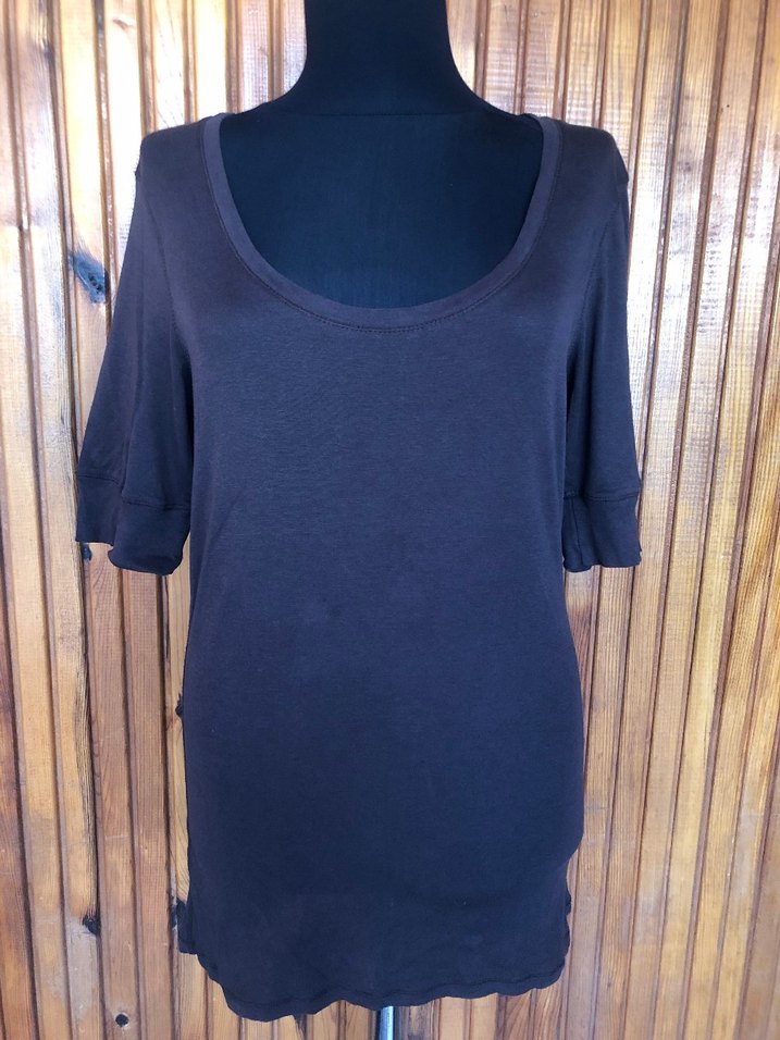 old navy marka kahverengi kısa kollu geniş bisiklet yaka pamuklu likralı sağ arkada sökük vardır dikilmiştir fotoğrafta belirtilmiştir L bedene uygun uzun kadın tişört koltukaltı ölçüsü 42 cm boy 70 cm