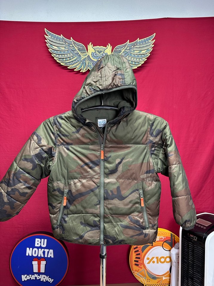 Koyu kahverengi kamuflaj desenli, kapüşonlu ve fermuarlı, rock punk tarzı erkek çocuk montu. Yumuşak ve sıcak kumaştan üretilmiştir. Ürünümüz usa ürünü 6-7 yaş uyumludur
