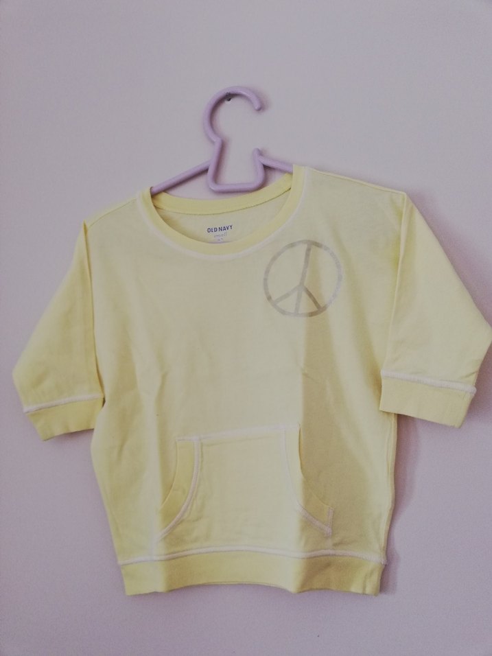 Ön cepli ve barış işareti baskılı sembollü, ✌️Old Navy marka sarı renk %100pamuk penye kumaştan kız çocuk tshirt. Yarım kollu dur. Bahar mevsimleri için uygundur. 6-7 yaş.Sıfır yaka, rahat kesim. Az kullanılmıştır. Temiz ve çok iyi durumdadır