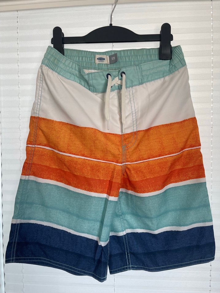 Erkekler için bol kesim, çizgili, çok renkli, plaj şortu. #xl #12yaş #13yaş #şortmayo #mayo #california #sanfrancisco 14-16 beden yazıyor ancak benim oğlum 13 yaşında bir kaç kez yani çok az kullandı