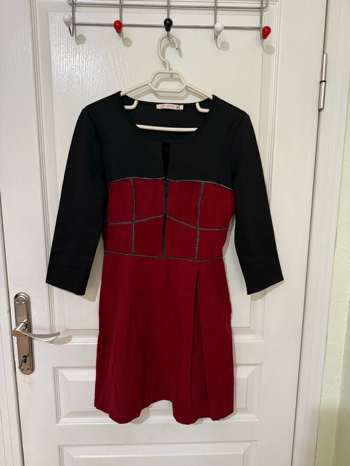 Bordo ve siyah renklerde, uzun kollu, işlemeli detaylara sahip düğmeli midi elbise. Ofis kullanımı için uygun, yakası kesim detaylı ve vücuda oturan kesim.