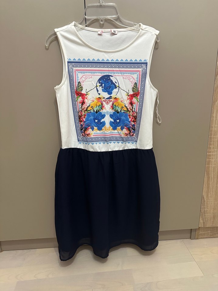 Ole marka, XS beden şık yazlık elbise. Üst kısmı esnek beyaz penye, alt kısmı lacivert şifon etek (astarli). Önünde kuş ve çiçek desenli renkli baskı var, omuzdan aşağı dökümlü duruyor. Günlük – ofis – akşam yemeği hepsine uyar. Bende duruşu çok güzel ama artık bedenim küçük geldiği için satıyorum. Yırtık, sökük, leke yok; sadece dolapta durduğu için ütü izleri var. Duman–evcil hayvan yok. • Beden: XS • Renk: Üst beyaz, etek lacivert • Kumaş: Üst %96 polyester %4 elastan, etek ve astar %100 polyester • Durum: Az giyilmiş, çok iyi durumda